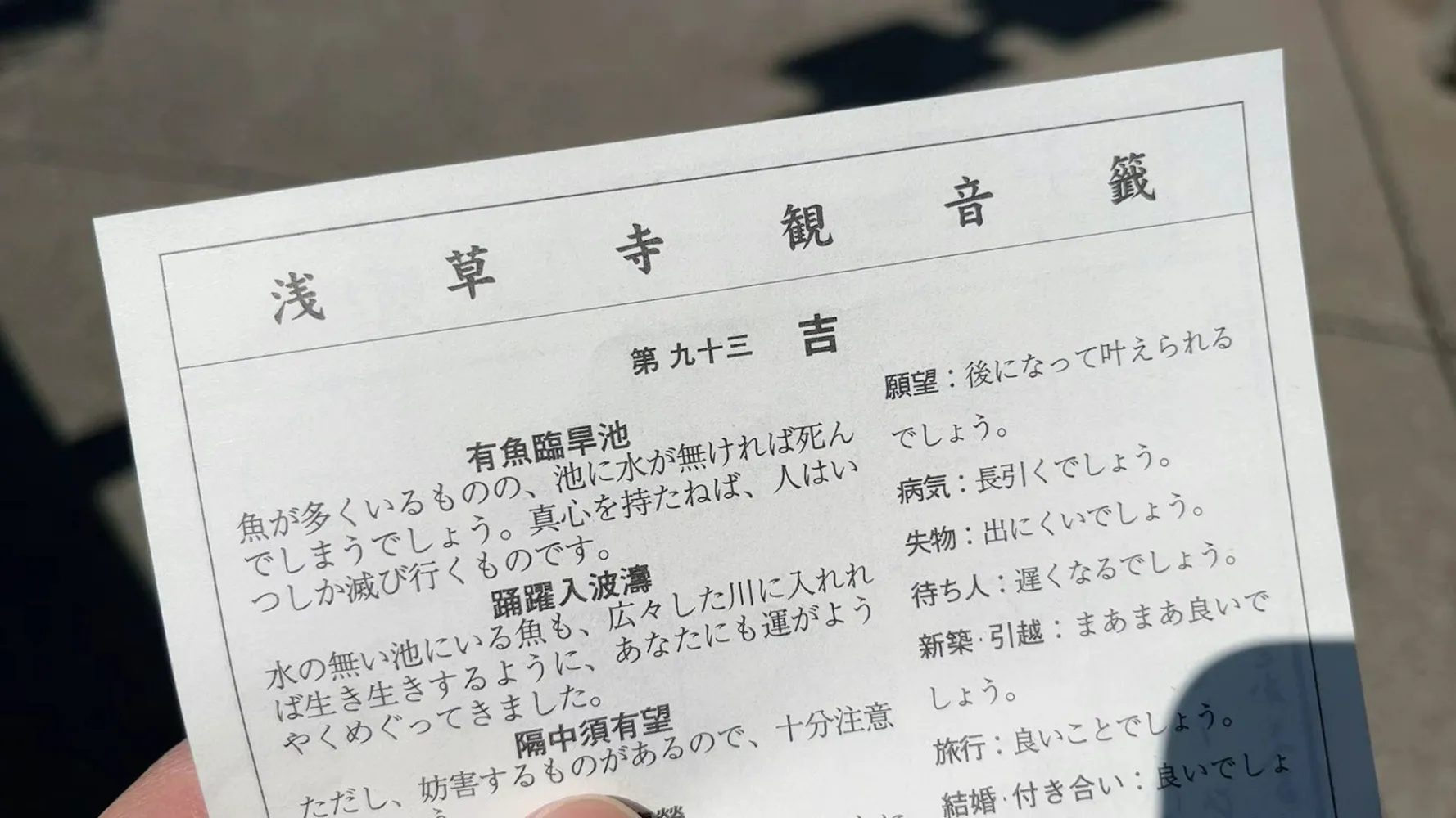 在浅草寺抽了一个签,非常幸运地抽到吉(也许没有凶呢 😂)
