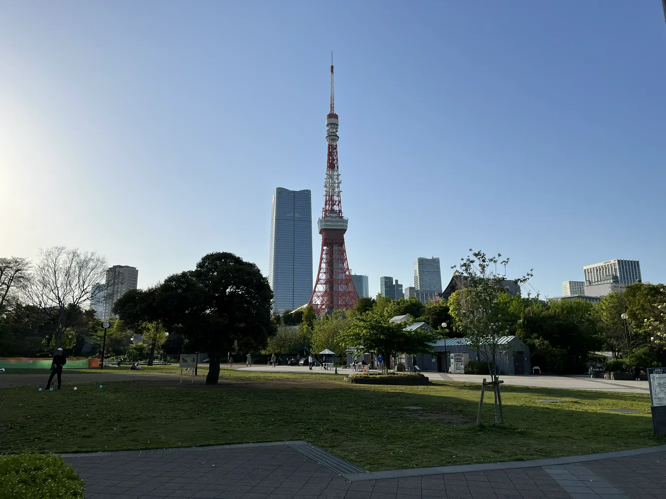 东京塔是在一个公园里(代代木公园),有很多带孩子露营的、遛狗的等等