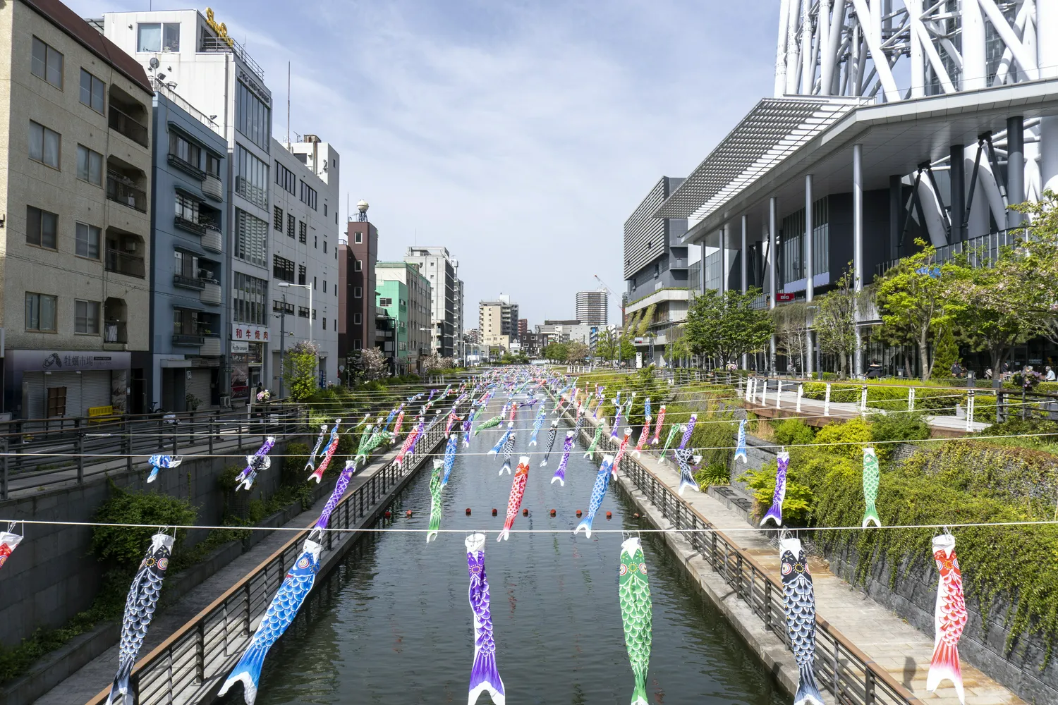 步行到晴空塔旁边,周围是一条河,上面挂了很多鲤鱼旗